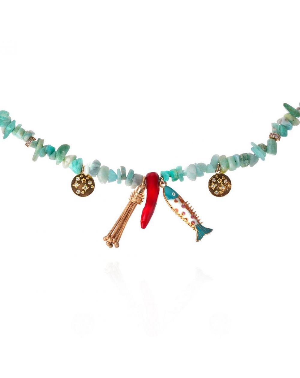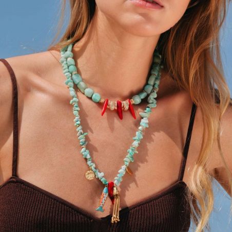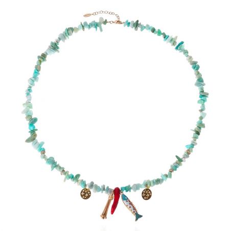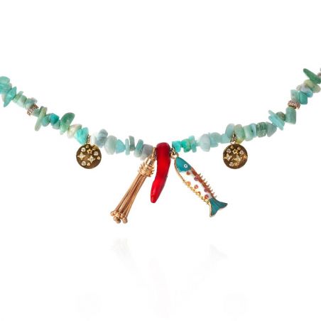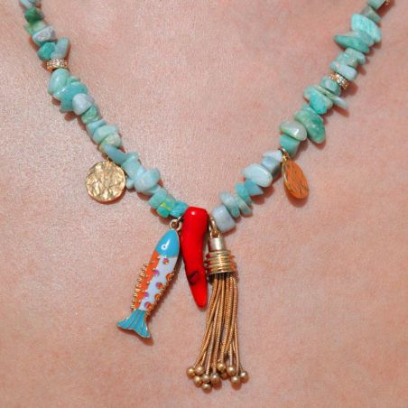 HIPANEMA célèbre l’énergie solaire et l’univers marin avec le collier Panyee, incarnation parfaite du thème Coral Coast. Doré à l’or fin, il se compose d’un délicat montage de perles turquoise, agrémenté de pampilles martelées et de notre emblématique trio marin : un sublime poisson émaillé, une branche de corail rouge vif en résine et une forme hybride aux tentacules envoûtantes. Une pièce pleine de charme et d’exubérance, idéale pour plonger dans l’été avec éclat !