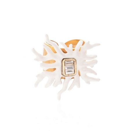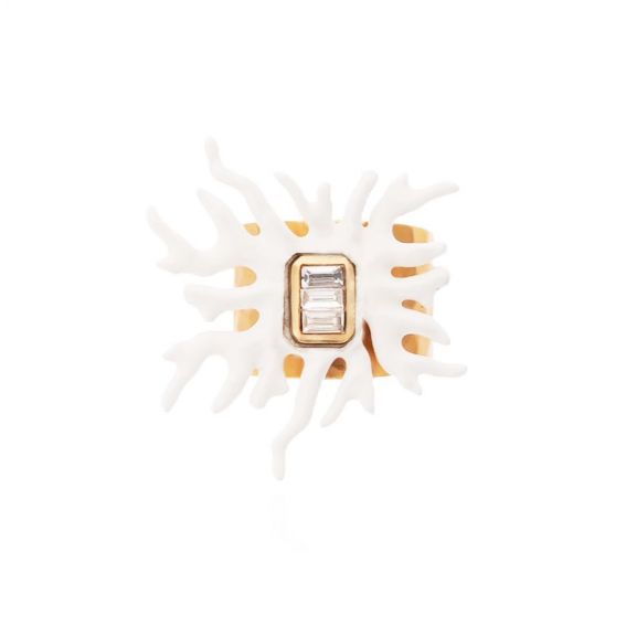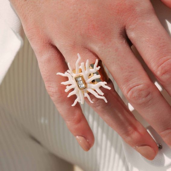 Exubérante et solaire, la bague Talassa incarne l’esprit vibrant de Coral Coast. Montée sur un anneau doré à l’or fin martelé, elle dévoile un somptueux cabochon serti aux éclats cristallins, entouré d’envoûtantes branches de corail en résine blanc irisé. Une pièce d’exception à l’identité forte, qui insuffle une touche follement chic et lumineuse à votre main et à votre allure !