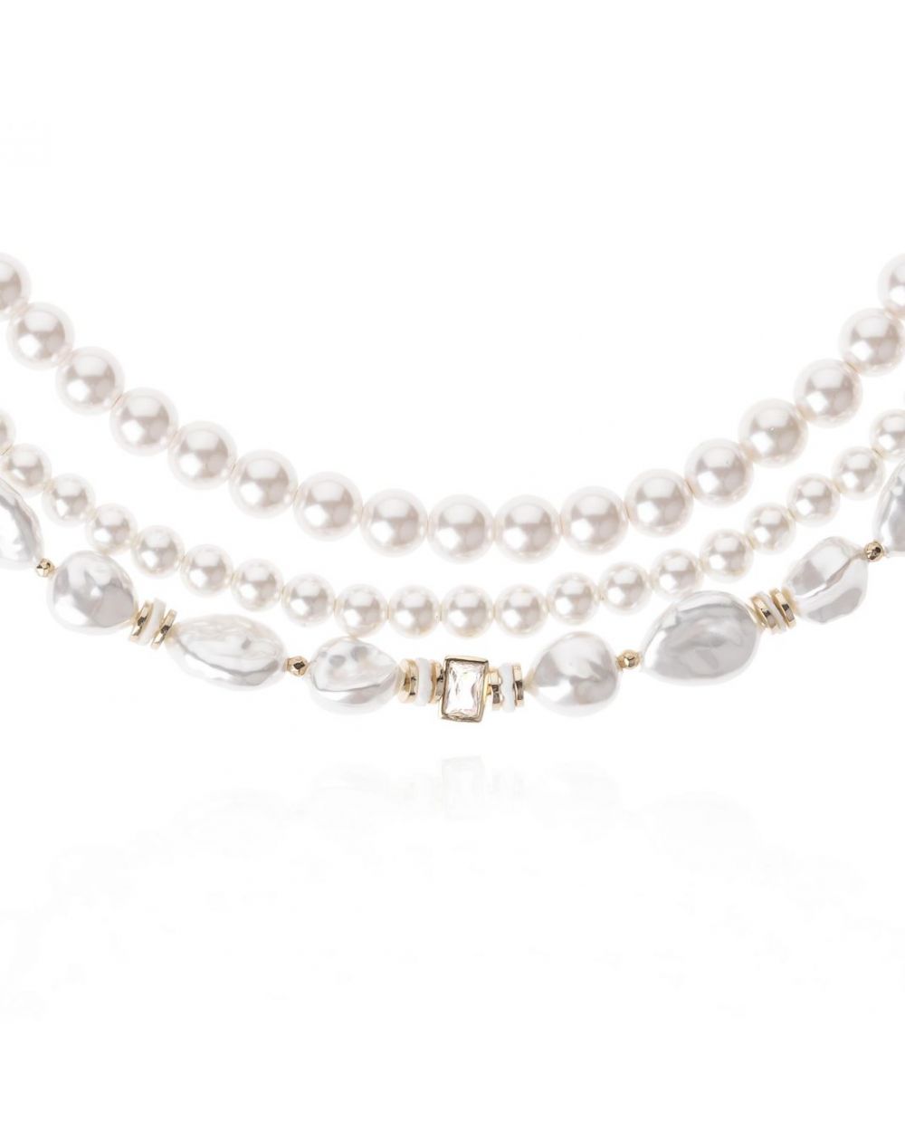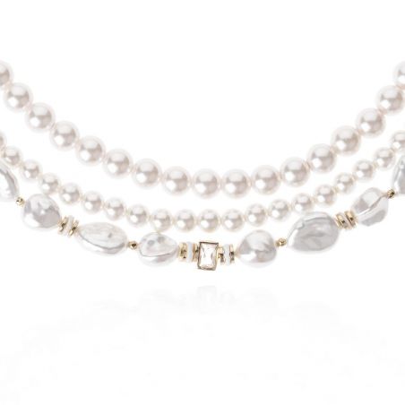 Finement doré à l’or fin et entièrement conçu à la main, il se compose de trois rangées délicates, ornées de perles aux formes irrégulières et aux nuances blanches irisées, rappelant les trésors des profondeurs océaniques. Des rondelles dorées rythment cette composition, tandis qu’un cabochon central en strass ajoute une touche d’éclat sophistiqué.