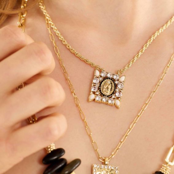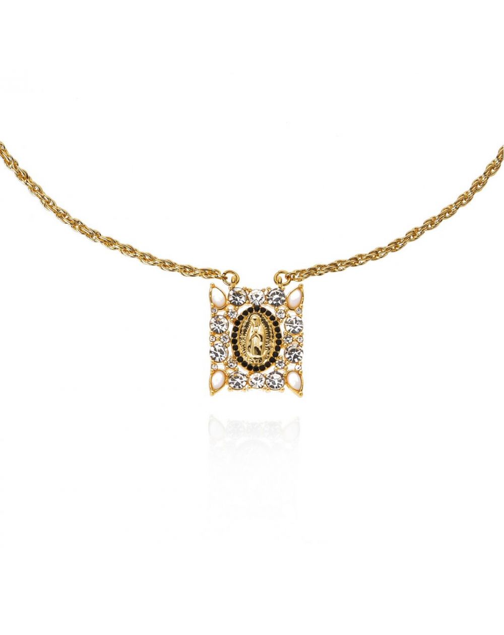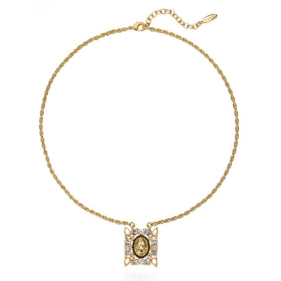 Monté sur une chaîne dorée à l’or fin, il se distingue par une vierge gravée sertie de mille strass effet diamant, trônant au centre d’une pièce rectangulaire scintillante, entièrement pavée de cristaux, de zircons et de quatre cabochons blanc nacré aux coins.