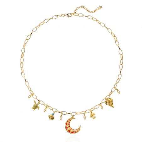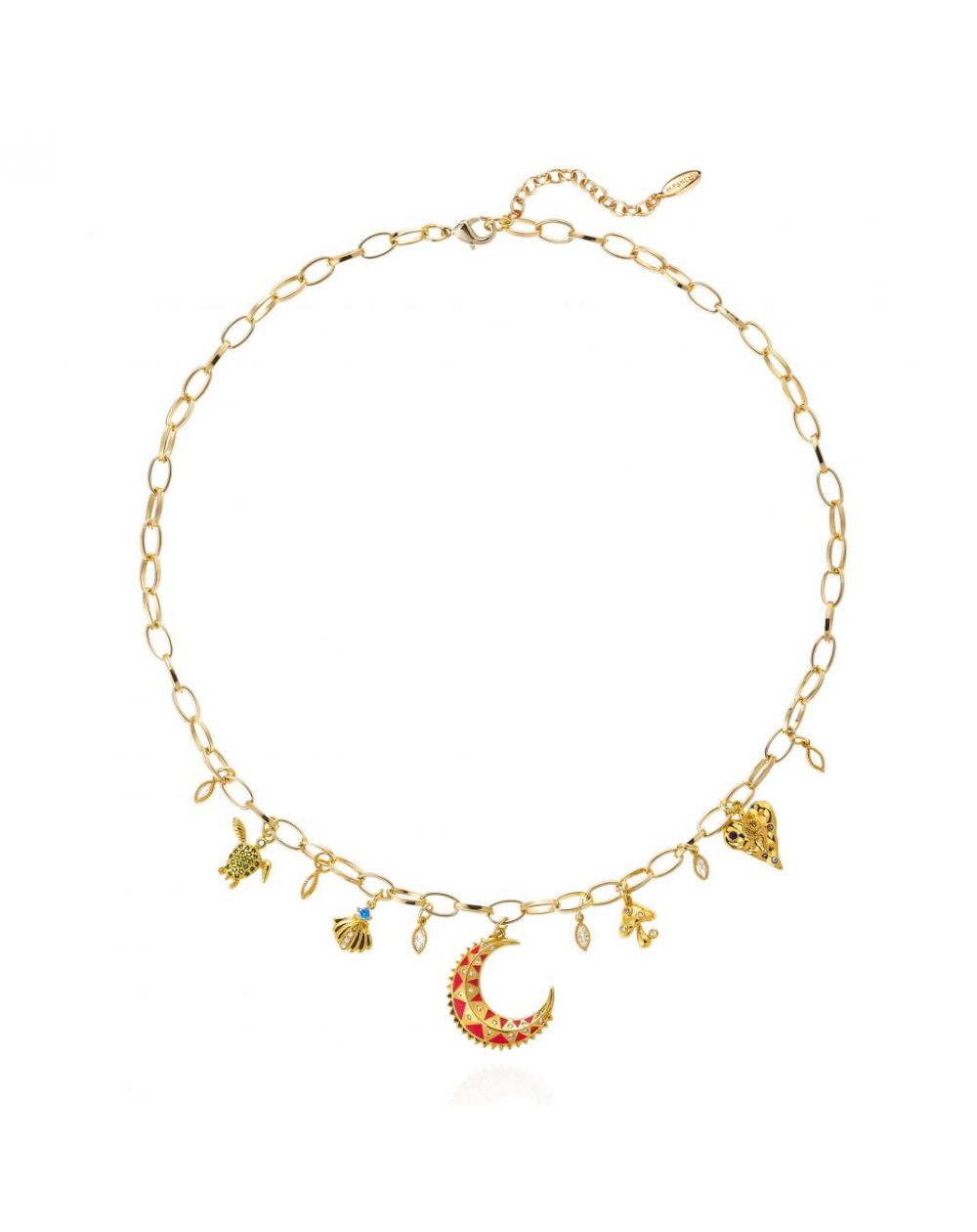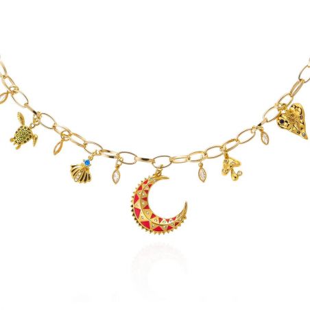 Le collier Chupito, issu du thème Brazil, est une pièce vibrante et porte-bonheur. Monté sur une chaîne forçat revisitée dorée à l’or fin, il s’illumine d’une magnifique lune en émail rouge vermeil, rehaussée de petits strass scintillants.