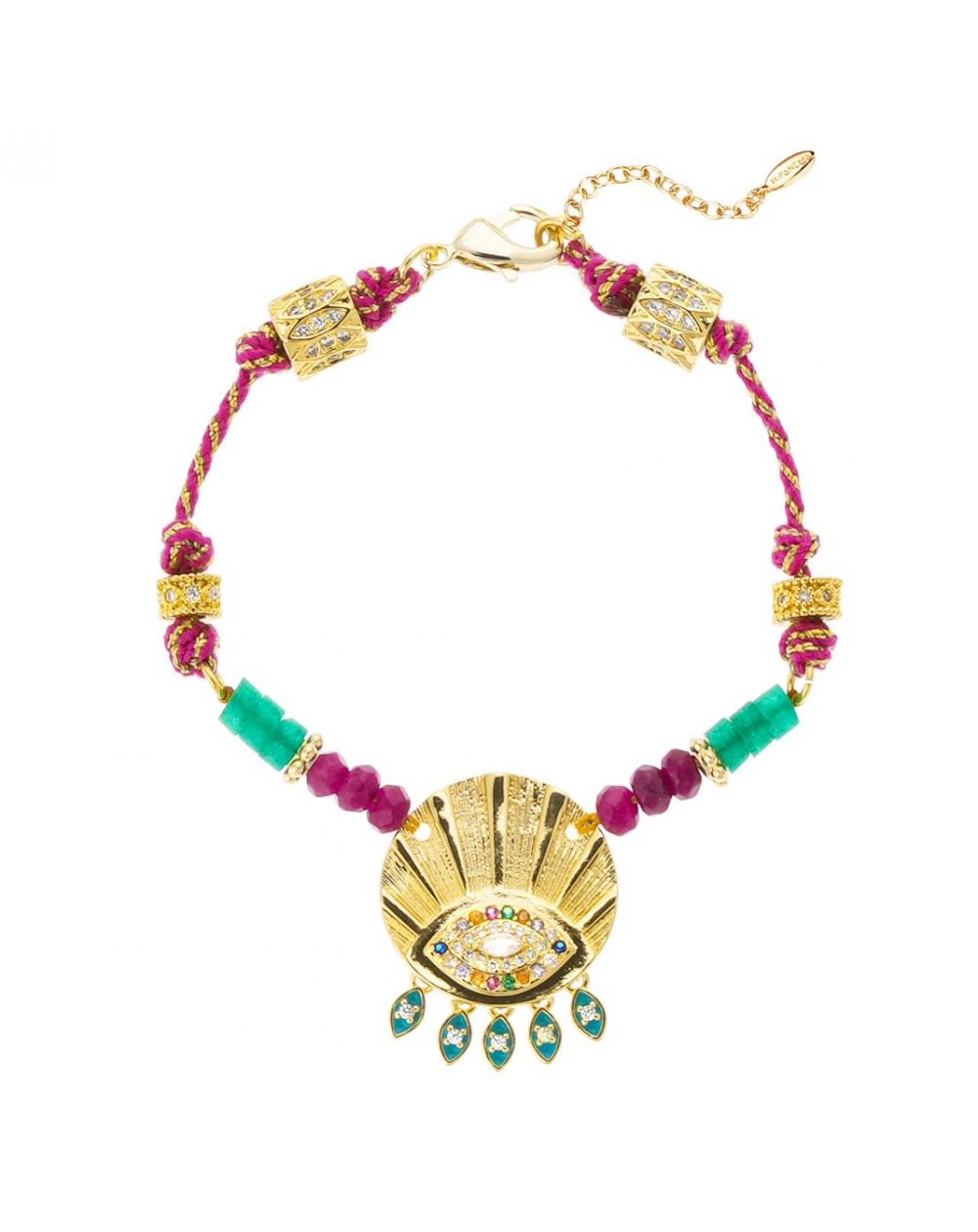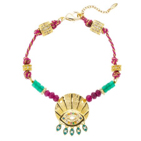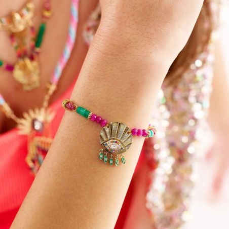 En son centre, une médaille finement gravée arbore un œil protecteur serti de strass multicolores, sublimé par une rangée de pampilles vert émeraude qui danse au gré des mouvements.