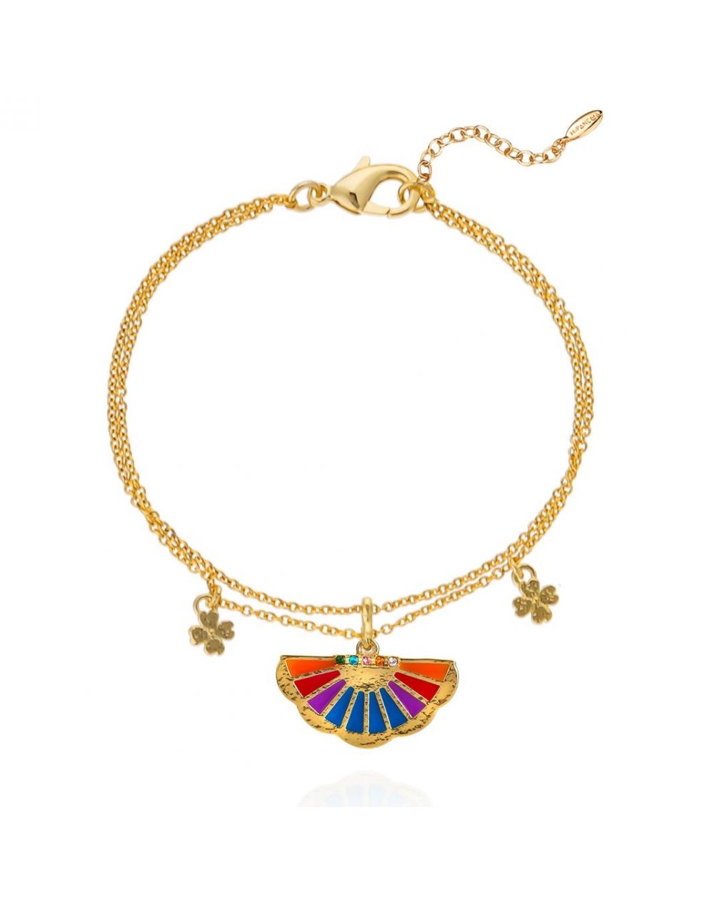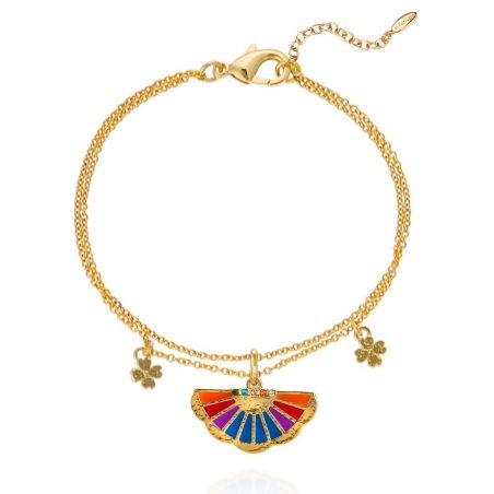 Doré à l’or fin et entièrement fait à la main, il se distingue par une double chaîne d’une exquise finesse, sublimant son design délicat. En son centre, une forme en demi-cercle aux couleurs émaillées s’illumine d’une rangée de strass multicolores, évoquant le plumage éclatant d’un oiseau de paradis.