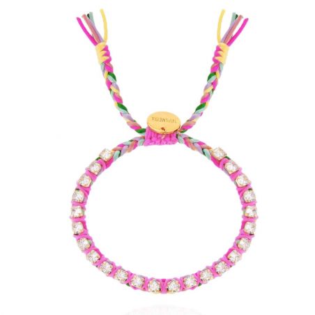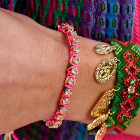 Tissé de fils multicolores aux nuances solaires, il s’entrelace autour d’une bande de strass effet diamant, captant la lumière avec éclat. Son système coulissant permet un ajustement parfait à toutes les tailles de poignets, pour un confort absolu.