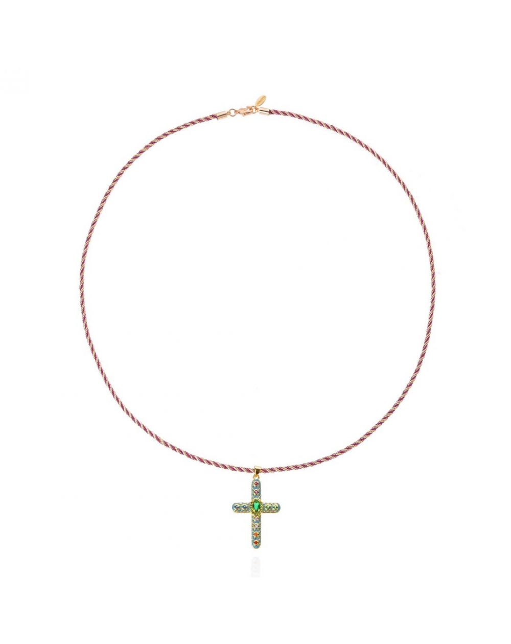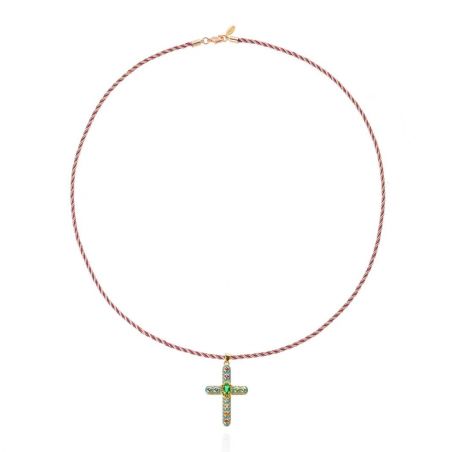 Ce long sautoir, inspiré du collier chapelet revisité, se distingue par une chaîne torsadée dorée et verte, offrant un jeu de textures sophistiqué. En son centre, une somptueuse croix en émail bleu ciel, ornée de strass multicolores, attire tous les regards. Son cœur scintille d’un cabochon aux reflets émeraude, entouré d’une délicate rangée de petits strass assortis, ajoutant une touche mystique et précieuse.