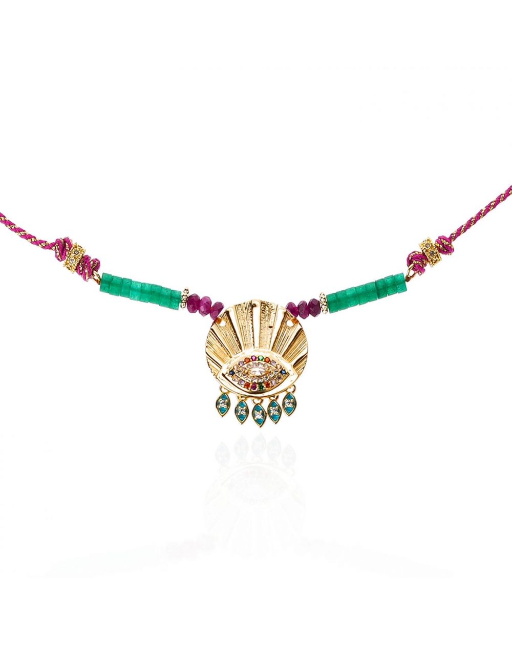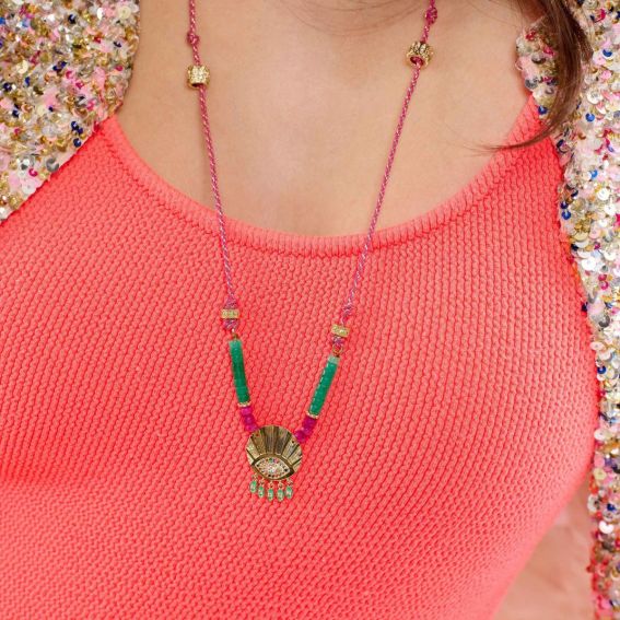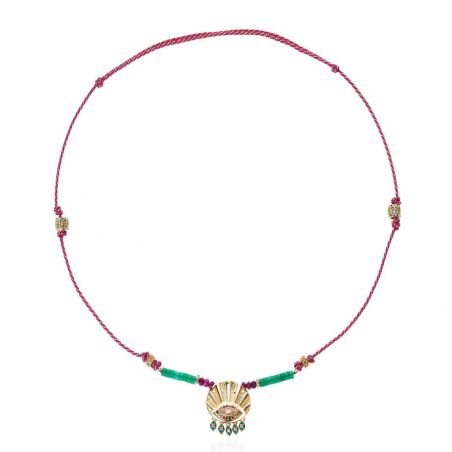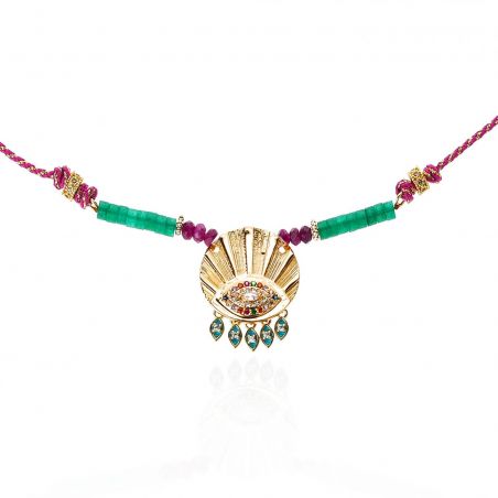 Entièrement doré à l’or fin et confectionné à la main, il se dévoile sur une chaîne torsadée dorée, sublimée par des perles vert émeraude et violettes. En son centre, une médaille finement ouvragée arbore un œil protecteur gravé, illuminé de strass multicolores.