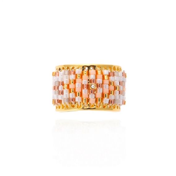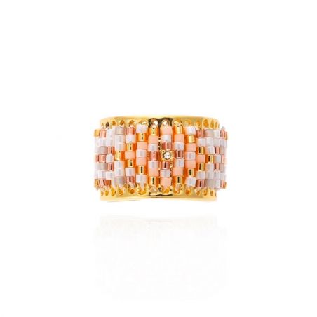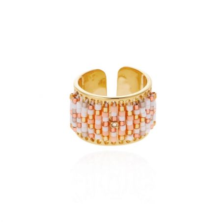Dorée à l’or fin et entièrement ouvragée, cette bague présente un motif géométrique délicat, mêlant tons blancs irisés, beiges et rosés, sublimé par un petit strass étincelant en son centre. Son design cossu et raffiné ajoute une touche de sophistication à toutes vos tenues.
