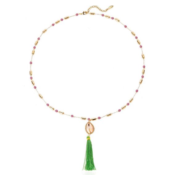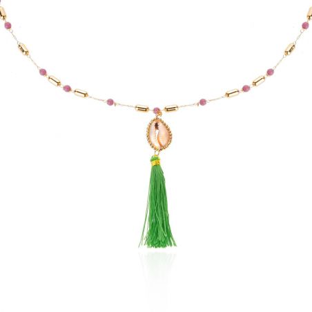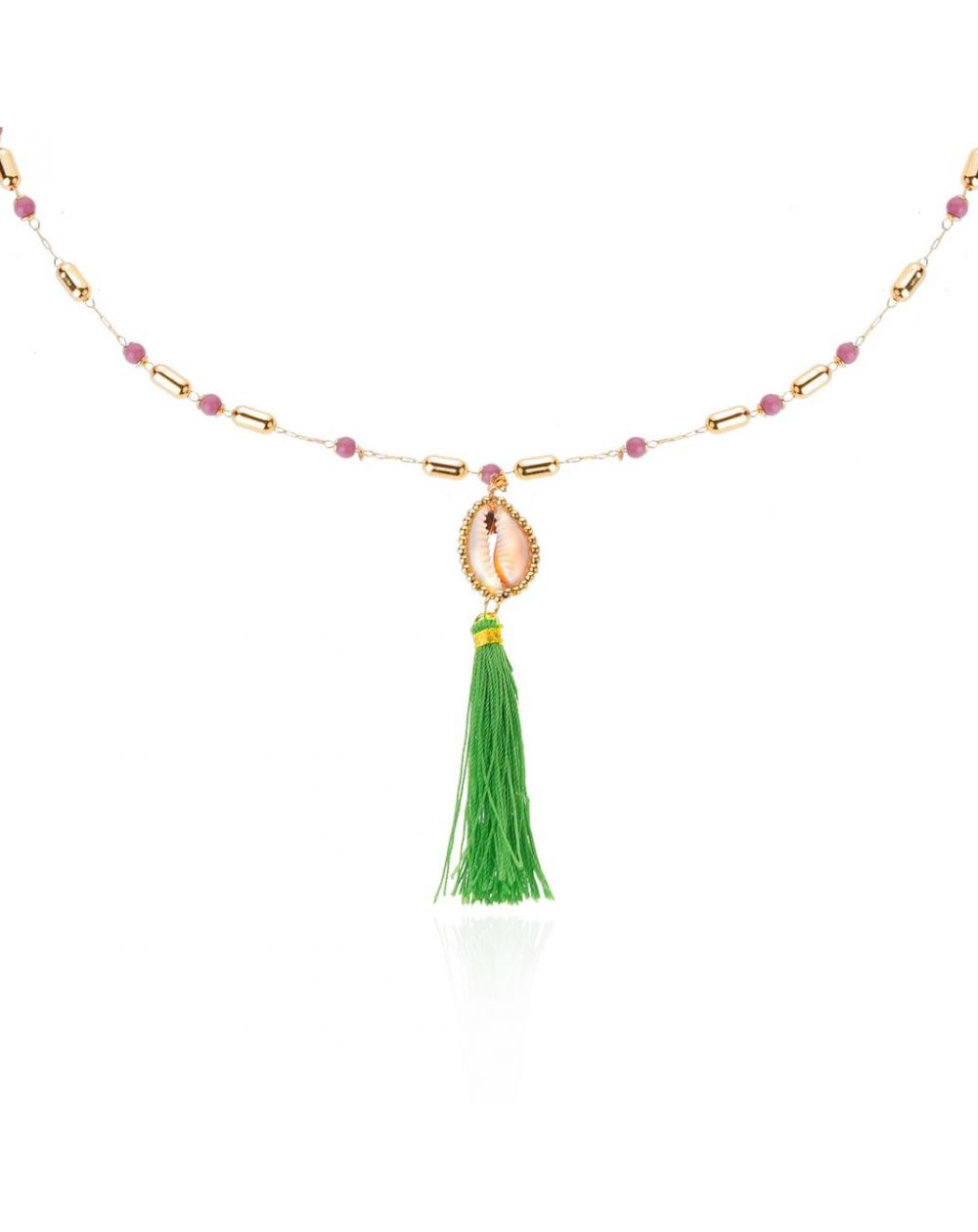Entre joyeuse croyance, gri-gris solaires, éclatante palette de couleurs et formes extravagantes, découvrez notre thème Brazil et notre collier Tamara! Long sautoir monté sur une chaîne chapelet réinterprétée par une alternance de perles ovales et rondes dorées et corail, le collier Tamara se pare d’un cori cerclé de perles boules dorées et d’un grand pompon vert prairie aux allures de gri-gris coloré et joyeux. Décliné en quatre couleurs, on le porte fièrement à son coup, comme un précieux trésor acidulé.