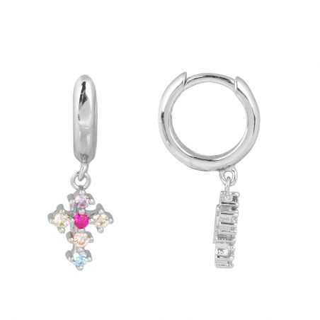 Ces boucles d'oreilles en argent 925 sont des créoles pour femme dotées d'une croix avec des petites pierres multicolores.