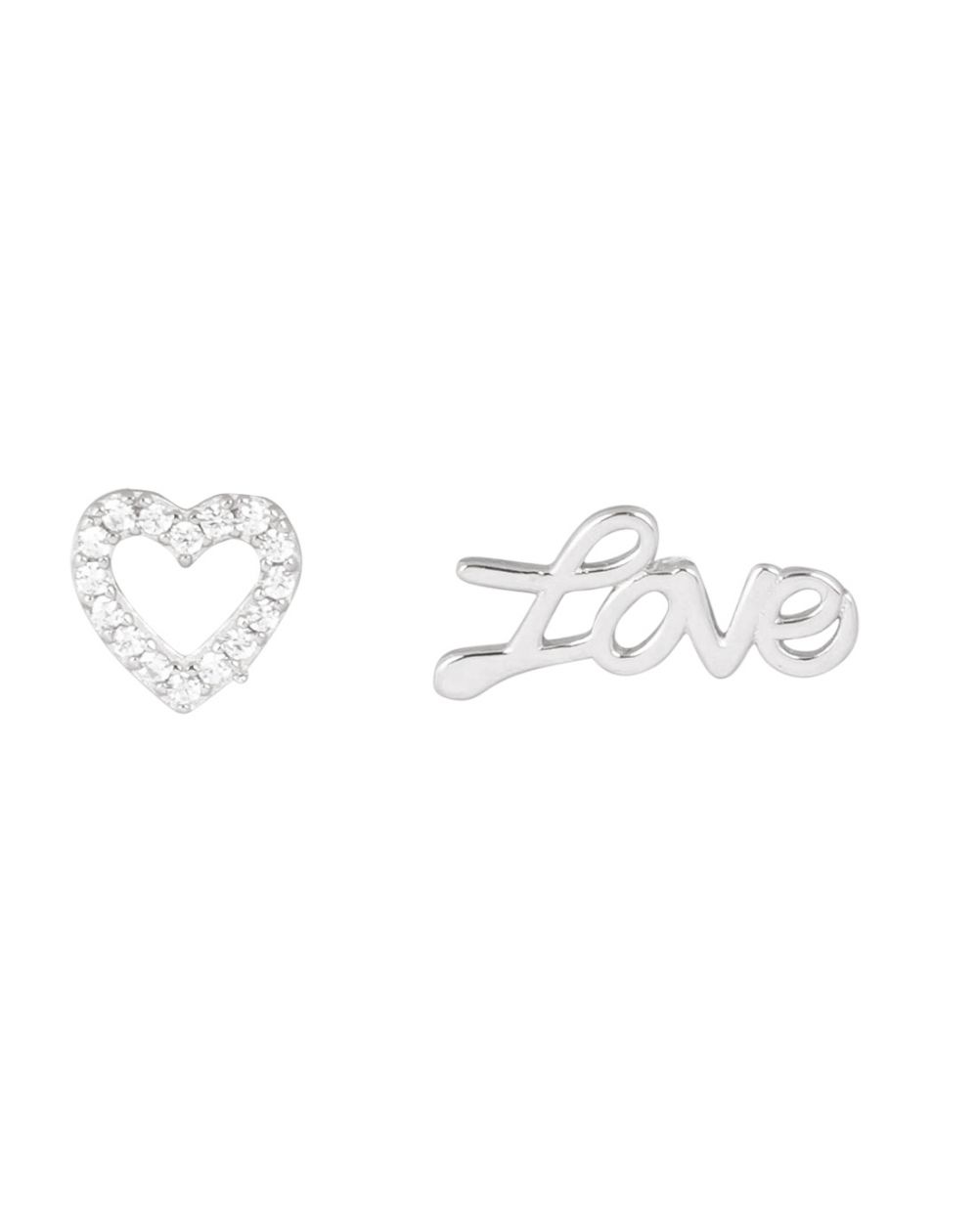 Ces boucles d'oreilles en argent 925 sont des perceuses asymétriques dont l'une est formée du mot LOVE et l'autre d'un coeur serti de pierres en oxyde de zirconium.