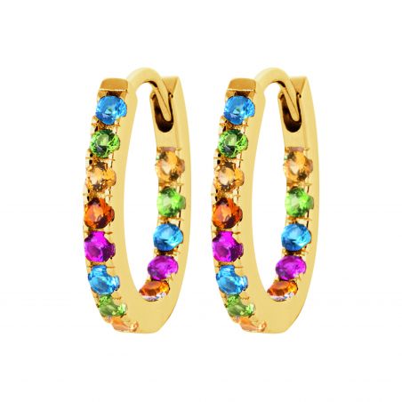 Ces boucles d'oreilles plaquées or 18 carats sont des créoles avec pierres multicolores.