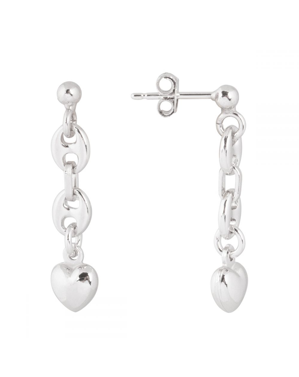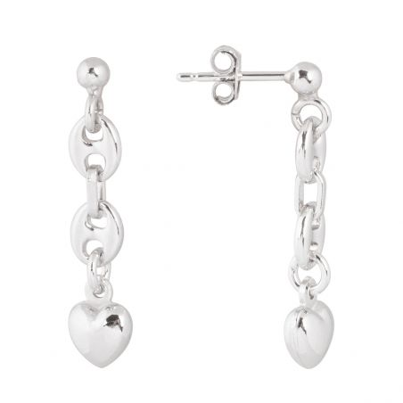 Ces boucles d'oreille en argent 925 sont des perceuses pendantes formées de mailles grain de café terminée par un coeur. Celles-ci mesure 30mm de haut.