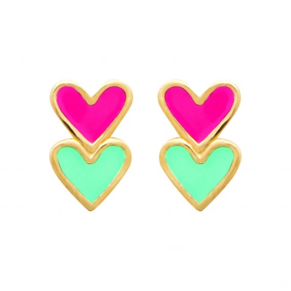 Cette boucle d'oreille plaqué or 18 carats est une perceuse avec coeurs émaillés rose et bleu
