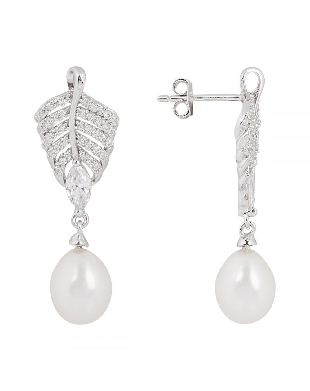 Ces boucles d'oreilles en argent 925 sont des perceuses en forme de feuilles serties de pierres en oxyde de zirconium et dotées d'une perle.