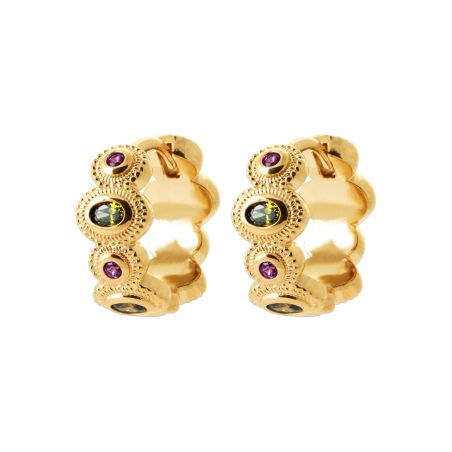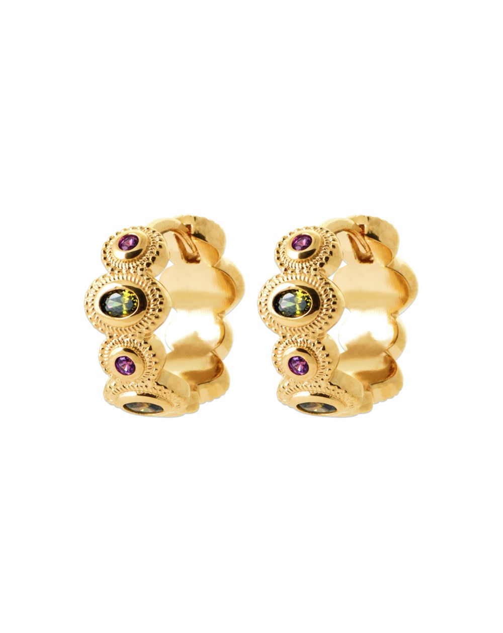 Ces boucles d'oreilles plaquées or 18 carats sont des créoles composées de multiples disques et pierres de couleurs