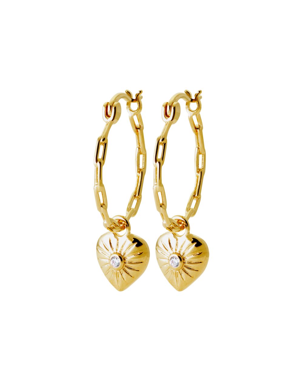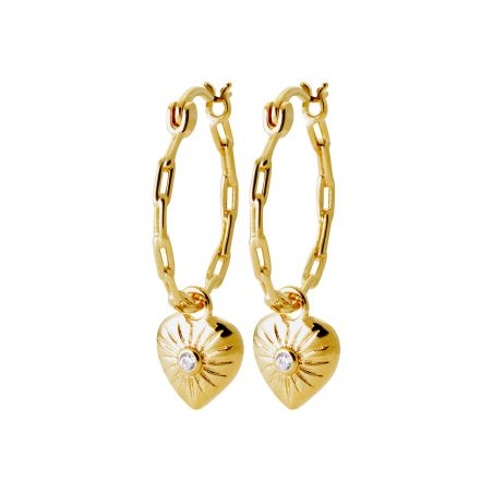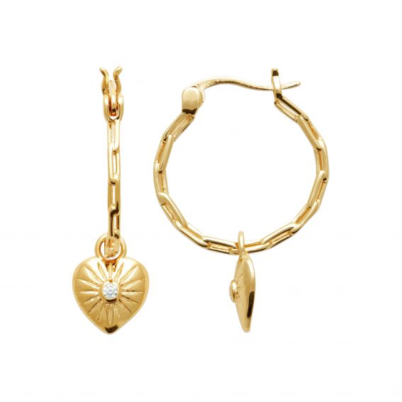 Ces boucles d'oreilles plaquées or 18 carats sont des créoles en forme de chaine à rabats avec des motifs coeurs pendants.
