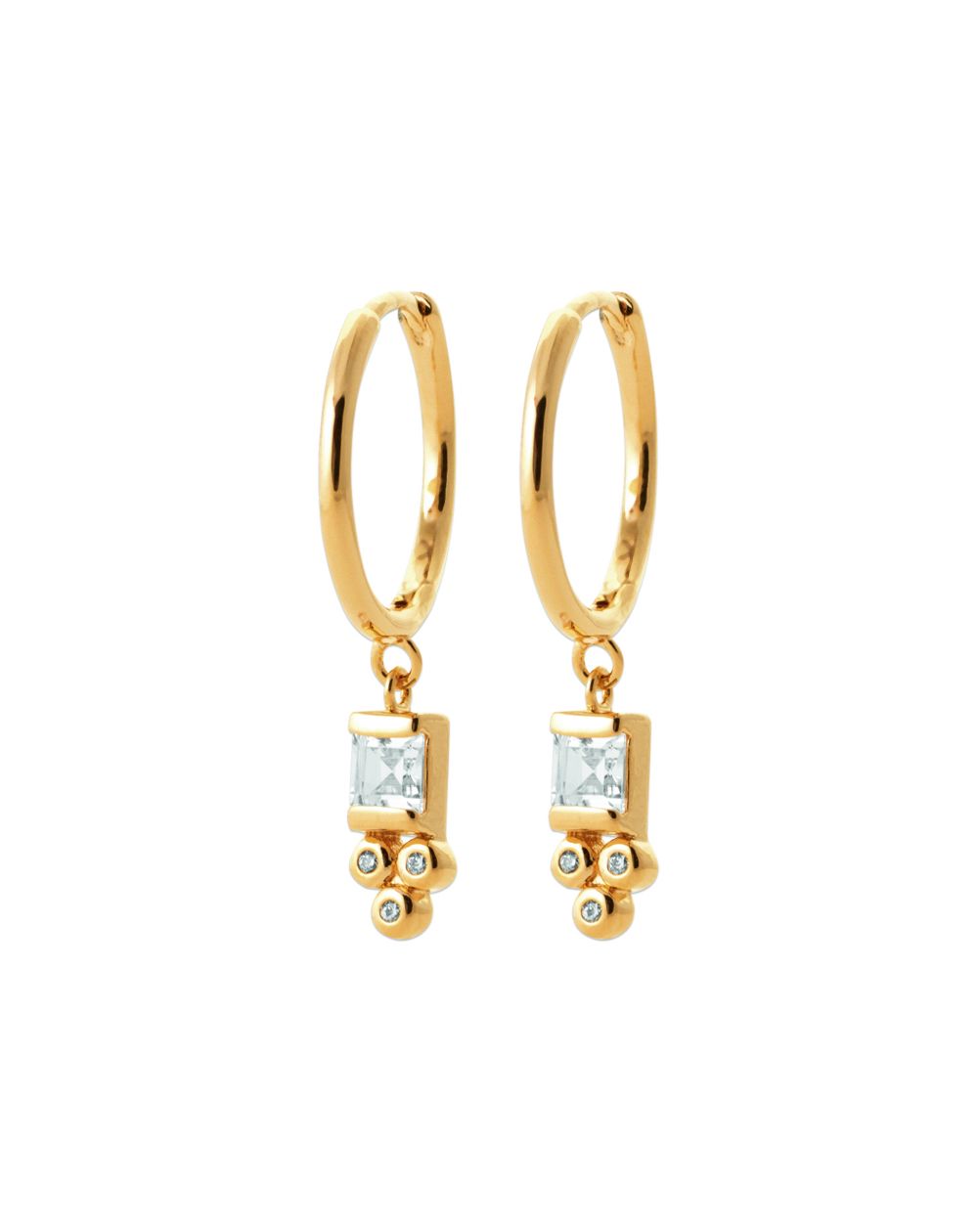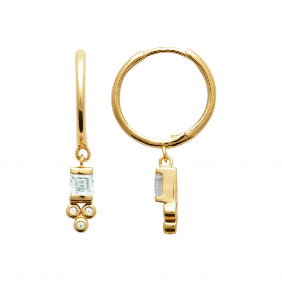 Ces boucles d'oreilles plaquées or 18 carats sont des créoles avec des rectangles en oxydes de zirconiums pendants.