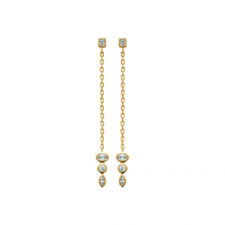 Ces boucles d'oreilles plaquées or 18 carats sont des perceuses pendantes avec chaine et oxydes de zirconiums de forme différentes.