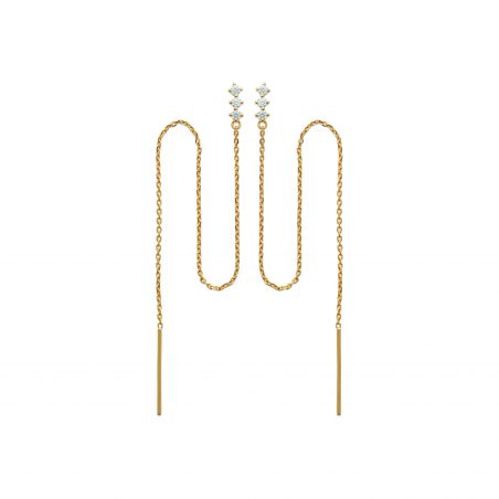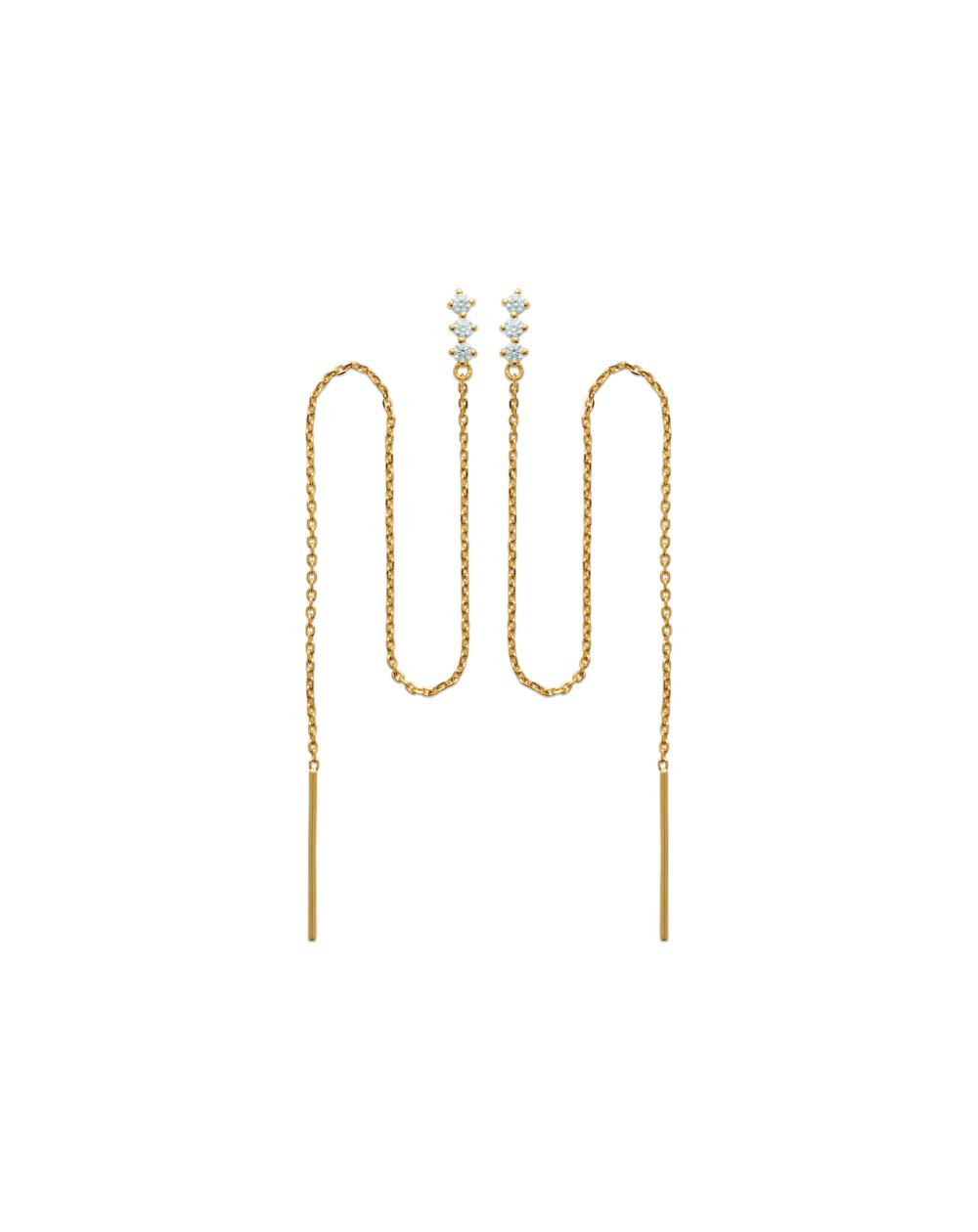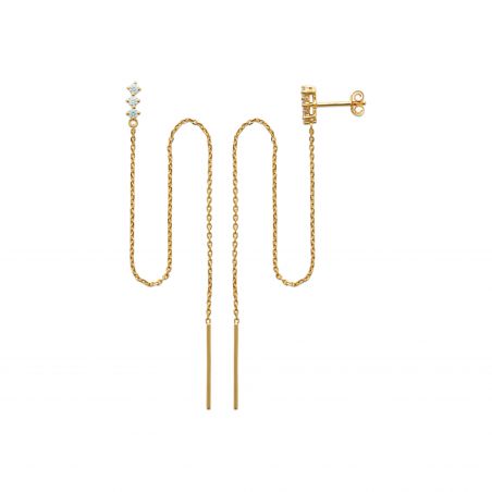 Ces boucles d'oreilles plaquées or 18 carats sont des perceuses composées de 3 oxydes de zirconiums et chaine.