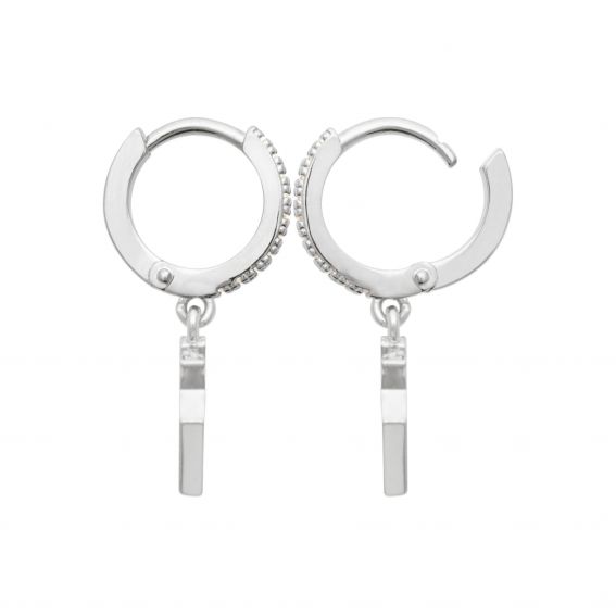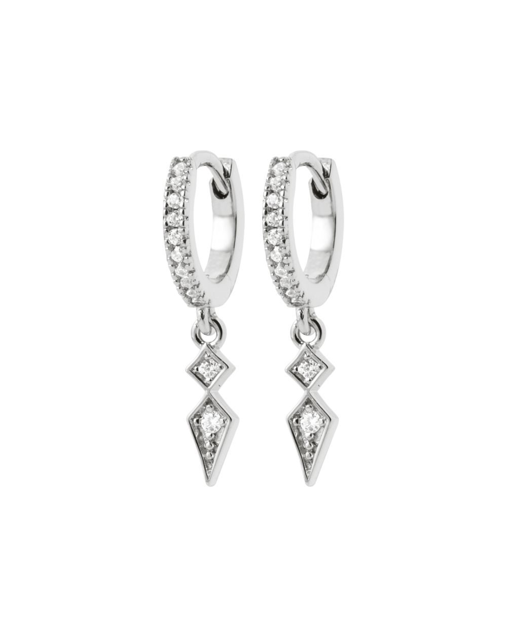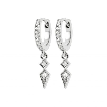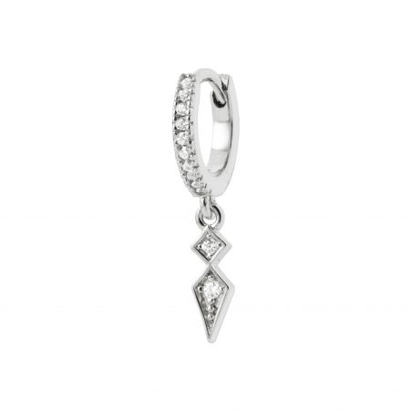 Il s'agit d'une créole en argent 925, ornée de pierres scintillantes alignées sur le bord frontal de l'anneau. Un pendentif en forme de deux losanges entrelacés, également incrusté de petites pierres brillantes, suspendu à la créole. Le design est élégant et moderne.