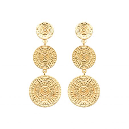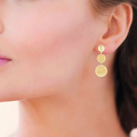 Ces boucles d'oreilles en plaqué or sont composées de trois médaillons ronds superposés. Chaque médaillon présente un motif central en relief avec des détails complexes et des bords perlés. Leur design artisanal et leur finition brillante ajoutent une touche d'élégance et de sophistication, parfaites pour compléter une tenue chic et raffinée.
