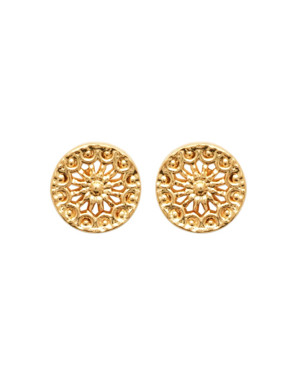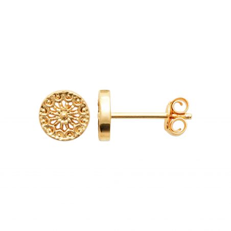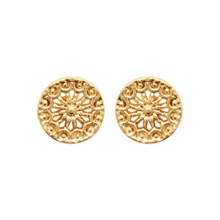 Ces boucles d'oreilles en plaqué or sont de forme ronde et arborent un motif ajouré délicat, rappelant une rosace ou un mandala. Le design est riche en détails, avec des motifs floraux stylisés et des textures en relief qui ajoutent de la profondeur et du caractère à chaque boucle. Ces boucles d'oreilles allient tradition et élégance, offrant une touche sophistiquée et intemporelle à n'importe quelle tenue.