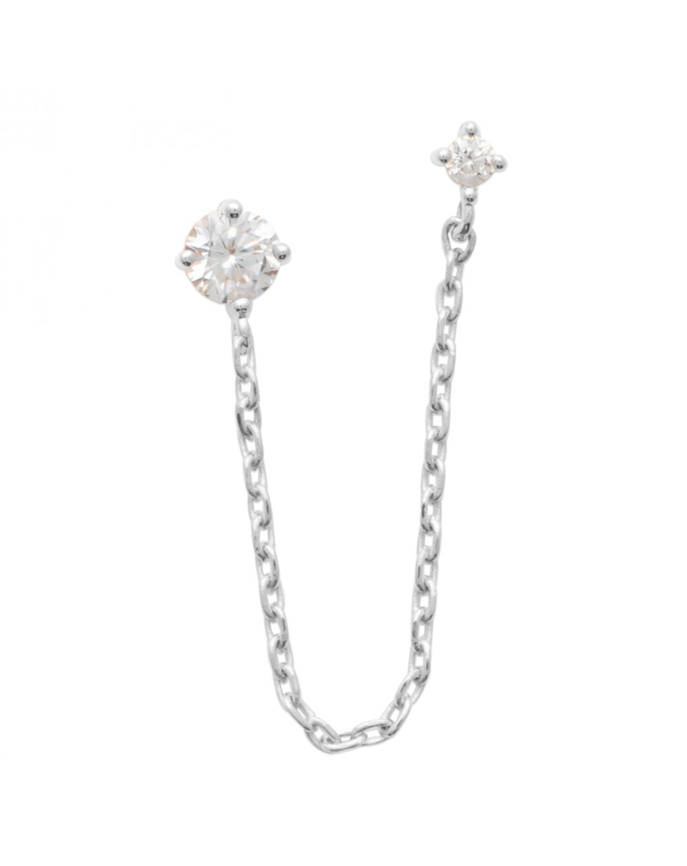Cette boucle d oreilles double se distingue par son design élégant et contemporain. Confectionnée en argent 925 rhodié, elle est composée de deux pierres en oxyde de zirconium étincelantes, chacune fixée délicatement à chaque extrémité d'une chaîne fine en argent. La chaîne relie les deux parties de la boucle, créant un effet suspendu moderne et raffiné.