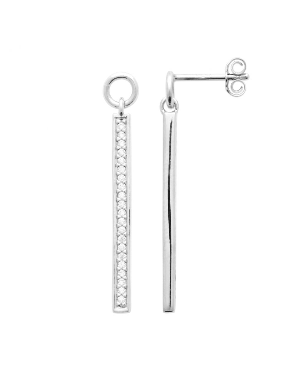 Ces élégantes boucles d'oreille barre empierrée en argent 925 rhodié se distinguent par leur design épuré et moderne. Leur silhouette allongée et rectiligne est ornée d'une rangée scintillante de pierres en oxyde de zirconium, capturant et réfléchissant la lumière avec éclat. La finition rhodiée garantit un éclat durable tout en protégeant l'argent contre le ternissement.