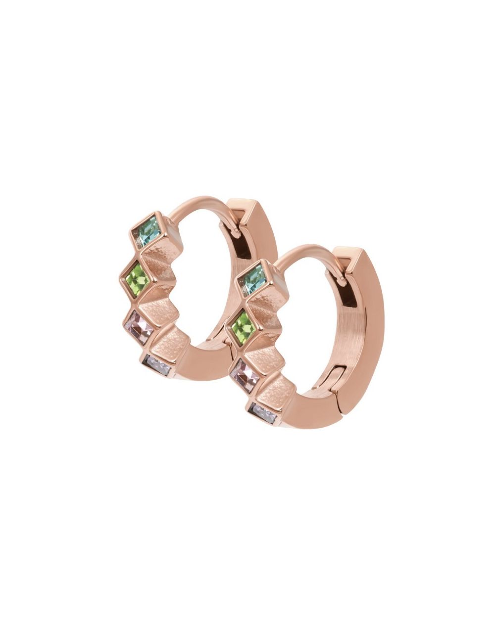 Ces créoles iXXXi en acier inoxydable doré se distinguent par leur design original en facettes géométriques, ornées de cristaux colorés sertis en pavage. Leur silhouette moderne et éclatante apporte une touche sophistiquée et audacieuse, parfaite pour rehausser n’importe quel look avec une élégance contemporaine.