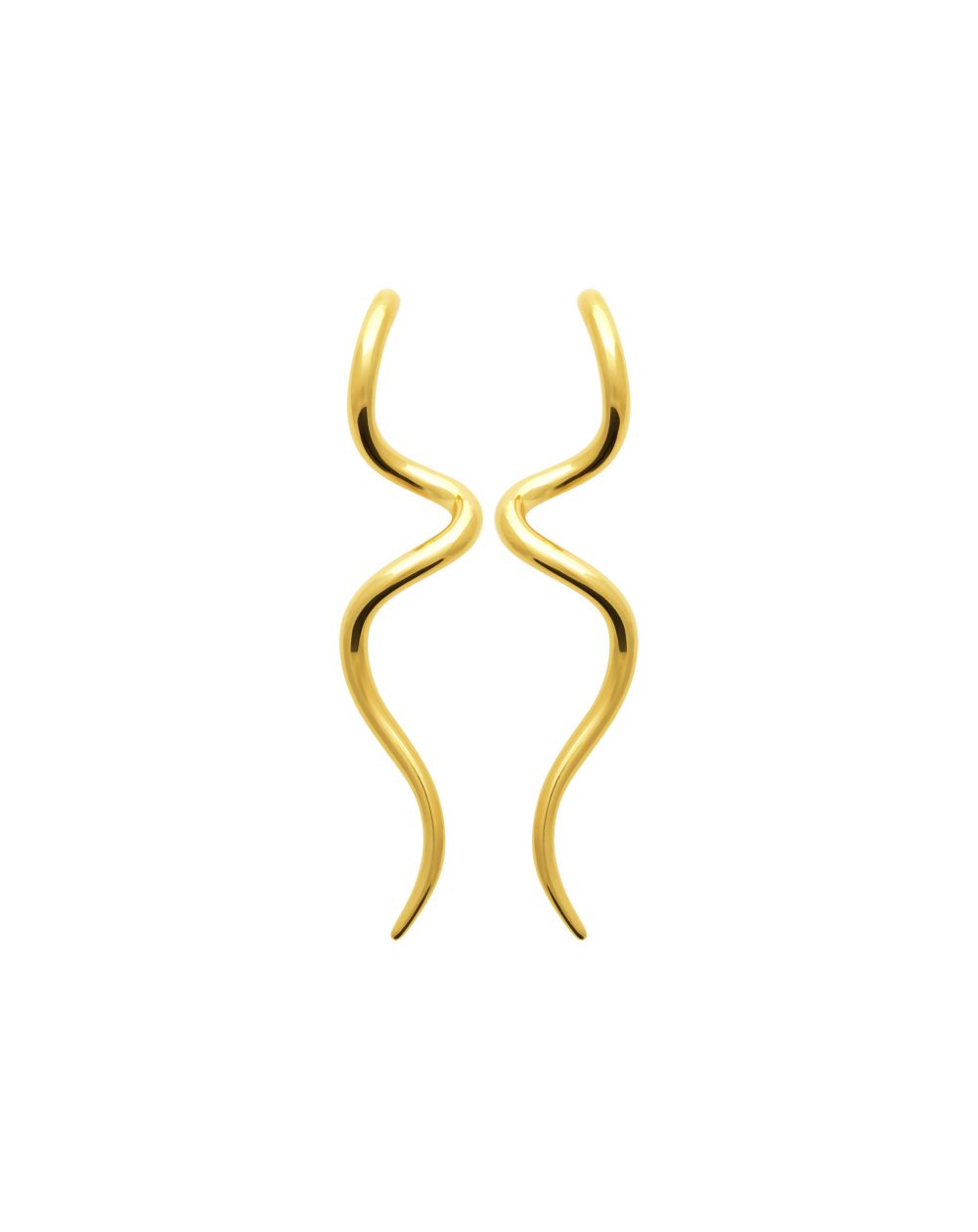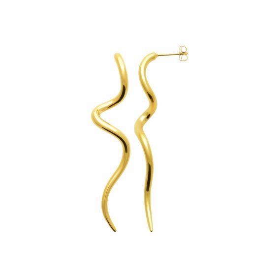 Ces boucles d’oreilles en acier doré affichent un design ondulé et fluide, évoquant un mouvement délicat et organique. Leur silhouette sculpturale et élancée apporte une touche de modernité et d’audace, parfaites pour un look contemporain et sophistiqué.