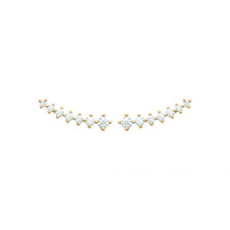Ces boucles d'oreilles en acier inoxydable doré affichent un design audacieux et raffiné. Composées d'une arche métallique lisse et brillante, elles sont sublimées par de fines chaînes tombantes en cascade, apportant du mouvement et une touche de sophistication. À la fois modernes et élégantes, elles offrent un look statement parfait pour une tenue chic et contemporaine.