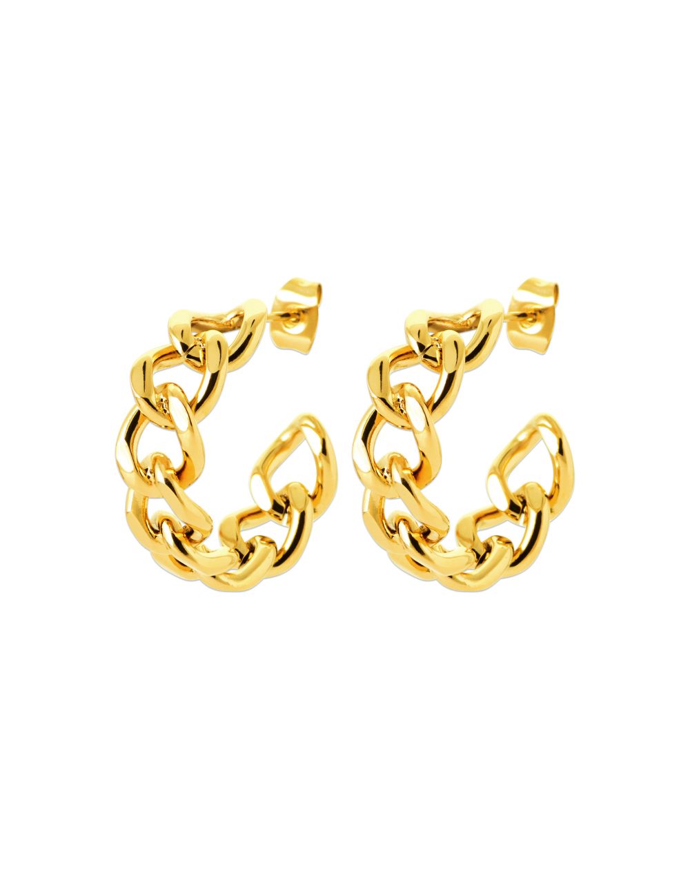 Audacieuses et tendance, les boucles d’oreilles Chainy Hoops revisitent la créole classique avec un enchaînement de maillons dorés à l’éclat vibrant. Conçues en acier inoxydable doré à l’or fin, elles allient style affirmé et confort. Leur design structuré et contemporain en fait un bijou phare, à porter en journée comme en soirée pour un look résolument moderne.