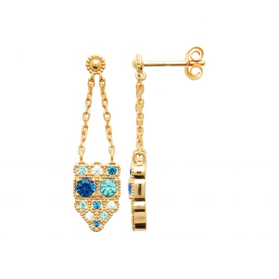 Plongez dans un éclat de fraîcheur avec les boucles d’oreilles Aquarella, élégamment plaquées or. Suspendues à de fines chaînes, elles dévoilent un pendentif scintillant serti de cristaux aux nuances bleues et blanches rappelant les reflets de la mer. Leur design raffiné et coloré sublime votre visage avec éclat. Une pièce lumineuse, idéale pour illuminer vos tenues de jour comme de soirée.