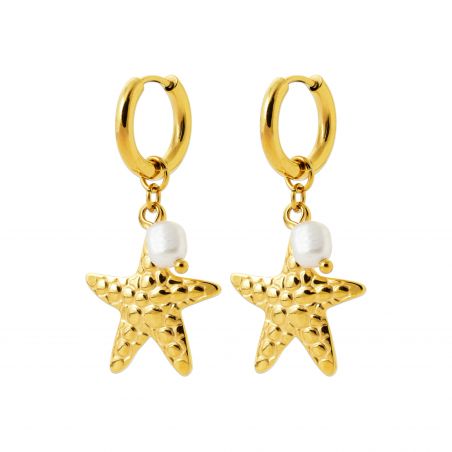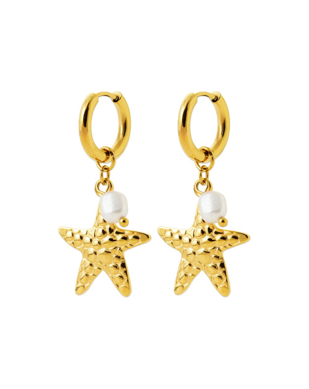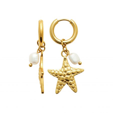 Ajoutez une note de magie marine à vos tenues avec les boucles Stellara. En forme d’étoile de mer martelée, suspendue à une créole dorée en acier inoxydable, chaque boucle est accompagnée d’une perle blanche naturelle, comme une perle oubliée au fond des océans.