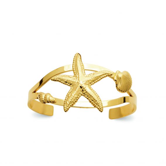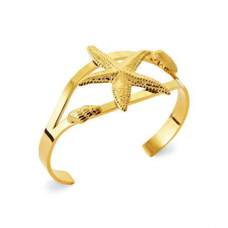 Symbole des merveilles cachées des fonds marins, la manchette Maristella s’impose comme une pièce maîtresse au design solaire et audacieux. Sculptée en acier inoxydable doré à l’or fin, elle met en scène une majestueuse étoile de mer en relief, encadrée de petits coquillages, comme échappés d’un trésor englouti.