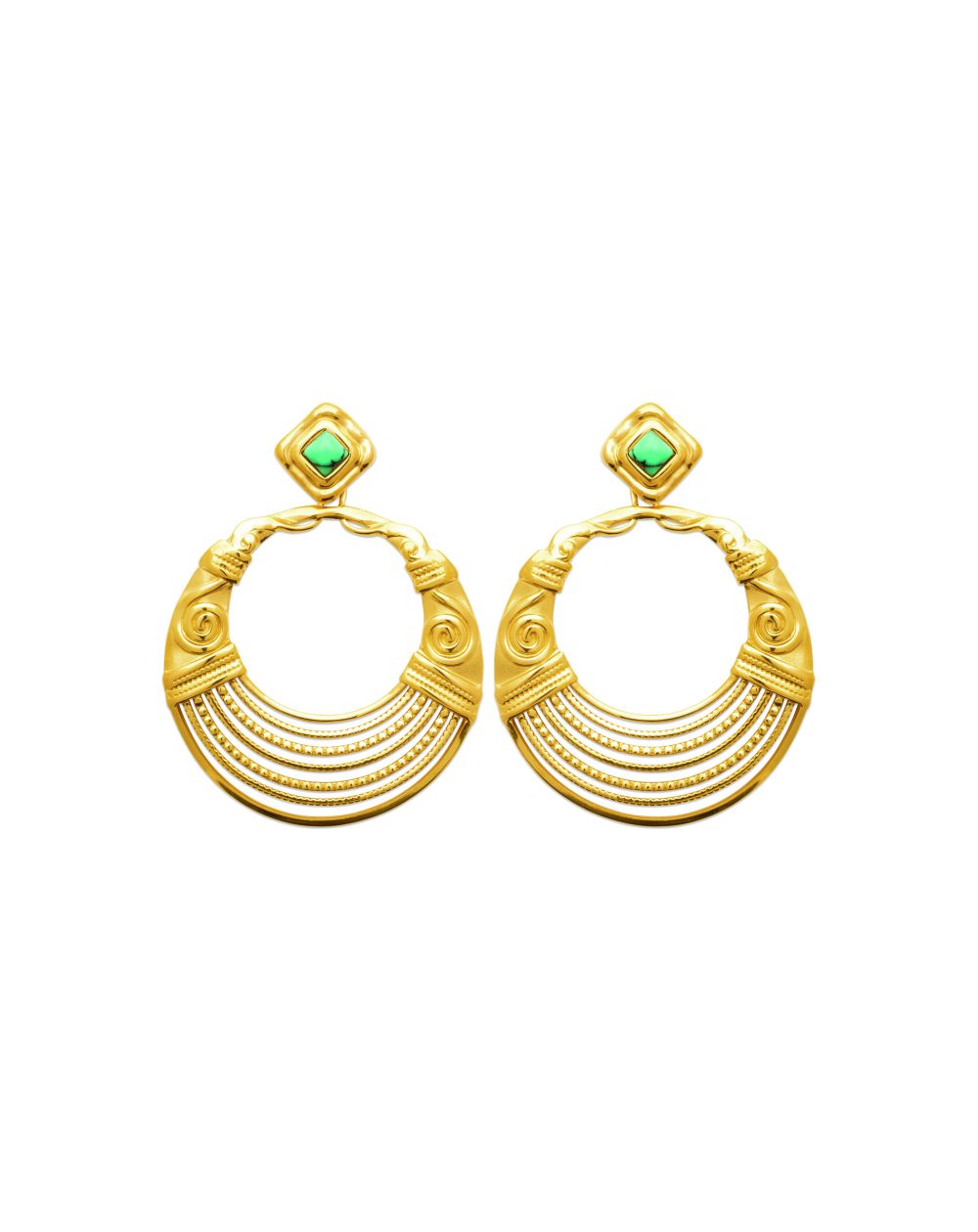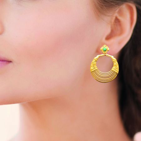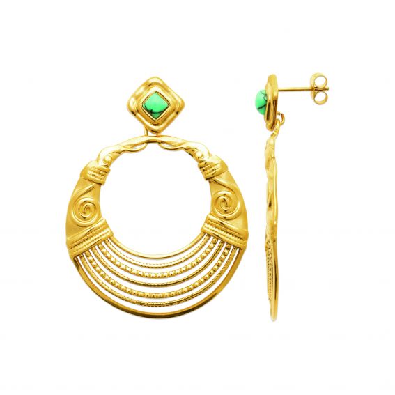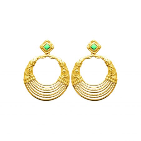 Les boucles d’oreilles Impéria Verde s’inspirent des parures majestueuses de l’Antiquité, revisitées dans une version moderne en acier inoxydable. Leur design sculpté, riche en détails, est sublimé par une pierre verte centrale qui apporte une touche noble et vibrante. Légères, audacieuses et spectaculaires, elles transforment instantanément n’importe quelle tenue en un look royal et affirmé.