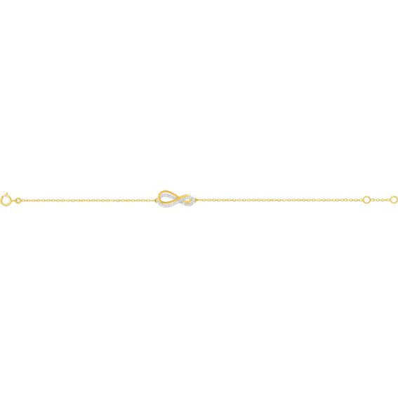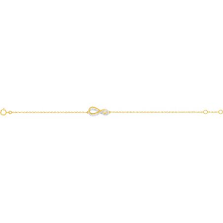 Ce bracelet en or 9 carats est un bracelet formé de 2 infinis dont un est empierré de pierres en oxyde de zirconium. Ce bracelet est réglable en longueur de 16,5cm à 18cm.