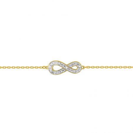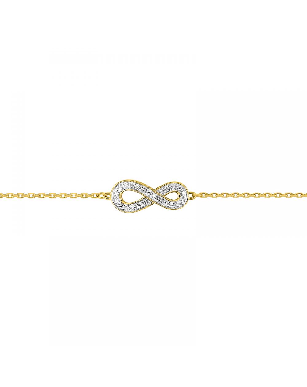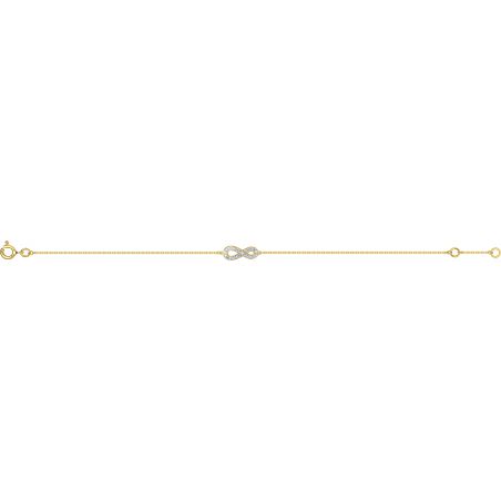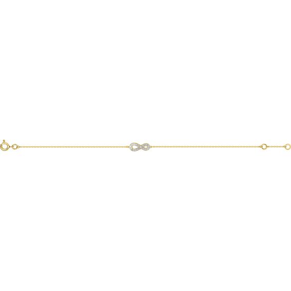 Ce bracelet en or 9 carats est un bracelet formé d'un infini empierré de diamants de 0,02 carat GH P2/P3. Ce bracelet est réglable en longueur de 16,5cm à 18cm.