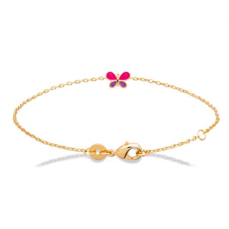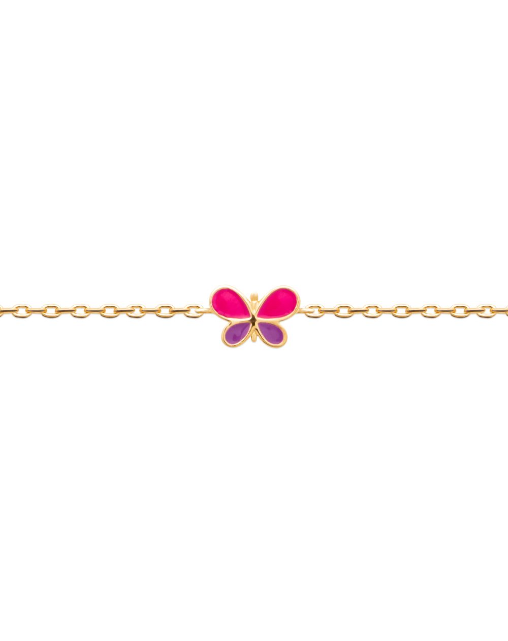 Ce bracelet pour enfant est un bracelet plaqué or 18 carats contenant un papillon émaillé rose et mauve