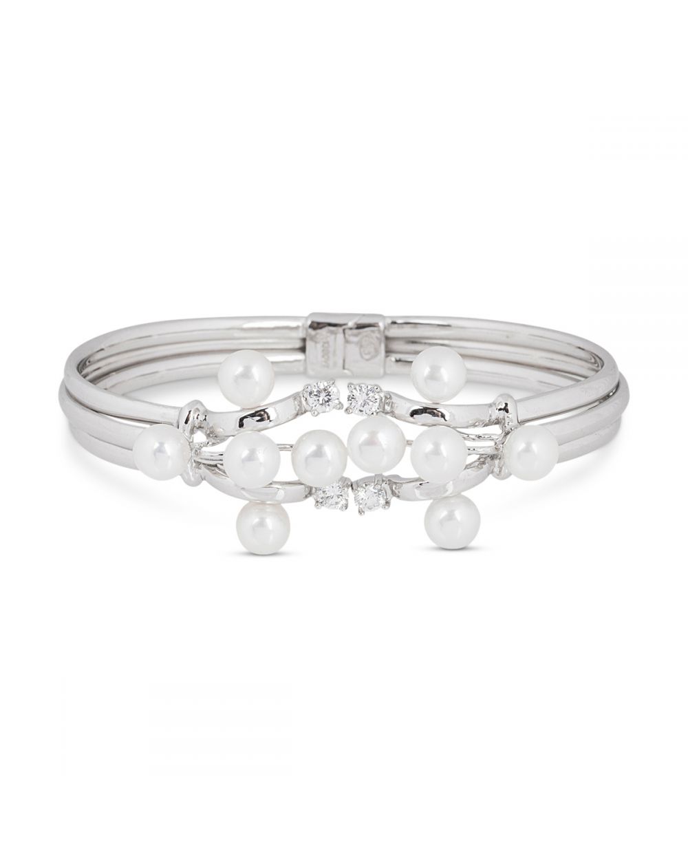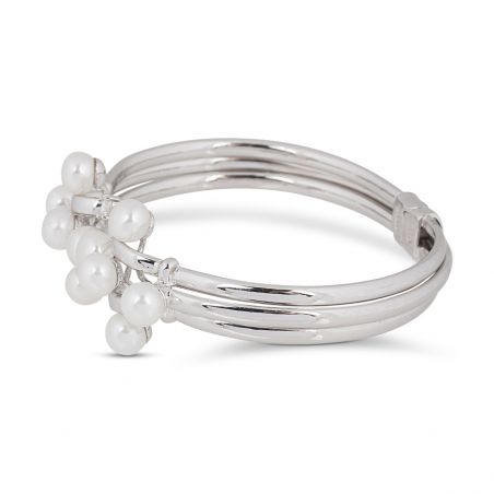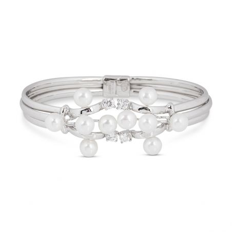 Ce bracelet est un esclave articulé (il s'entrouvre grâce à une charnière) doté de différentes perles blanches mesurant 7mm de diamètre et de pierres en oxyde de zirconium.