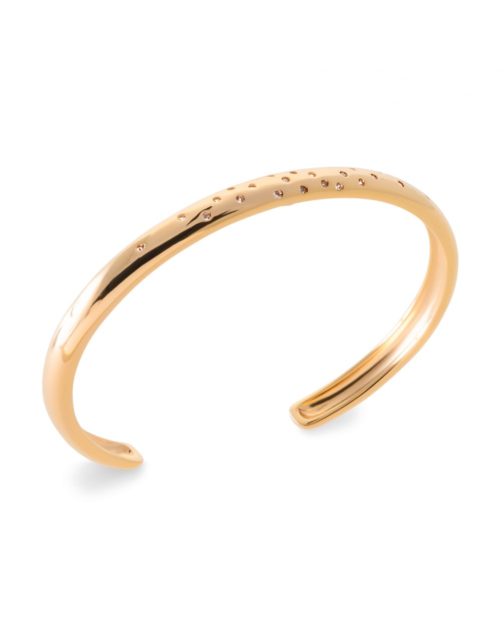 Ce bracelet pour femme plaqué or 18 carats de haute qualité est un jonc ouvert serti de plusieurs pierres en oxyde de zirconium.