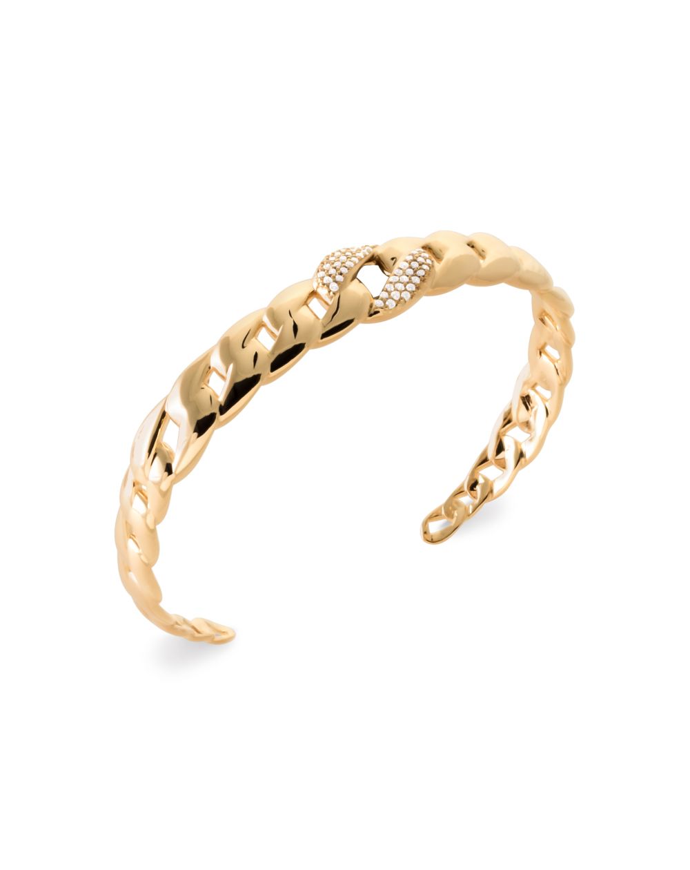 Ce bracelet pour femme est un jonc ouvert plaqué or 18 carats formé de maille plate. Ce bracelet mesure 32mm de large.