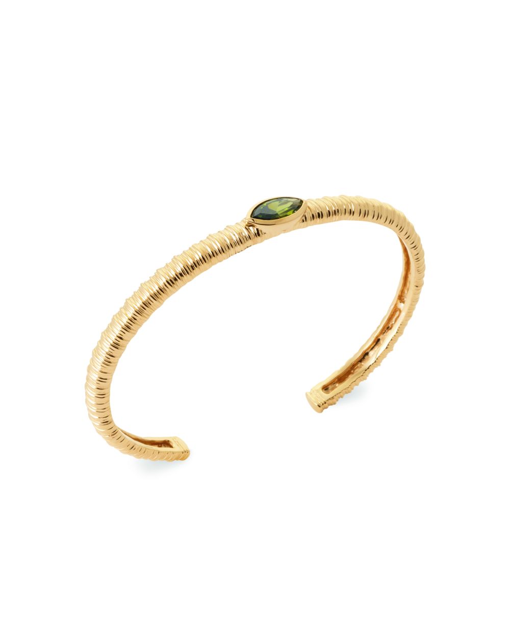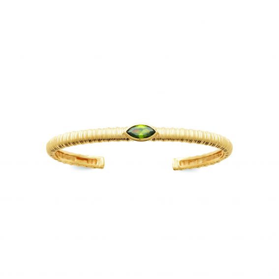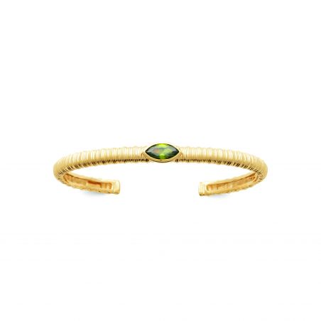 Cette esclave est une esclave ouvert et striés en plaqué or 18k, il est doté d'un pierre verte. Il a une garantie de 10 ans sur le plaquage.