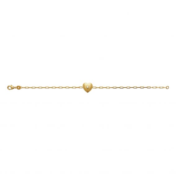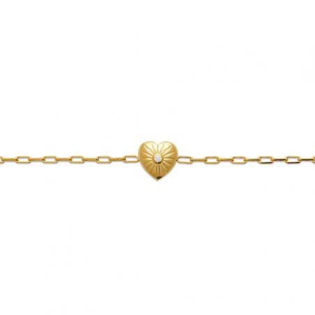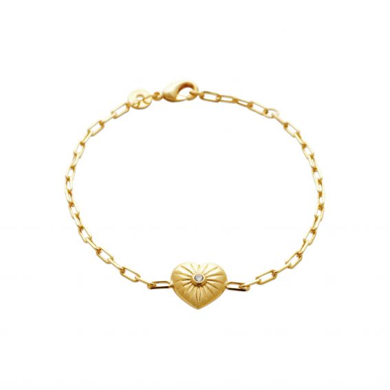 Ce bracelet est un bracelet en plaqué or 18k. Ce bracelet mesure 18cm de long et peut-être réglé en longueur.il est composé d'un coeur et d'une pierre centrale sur une maille large.