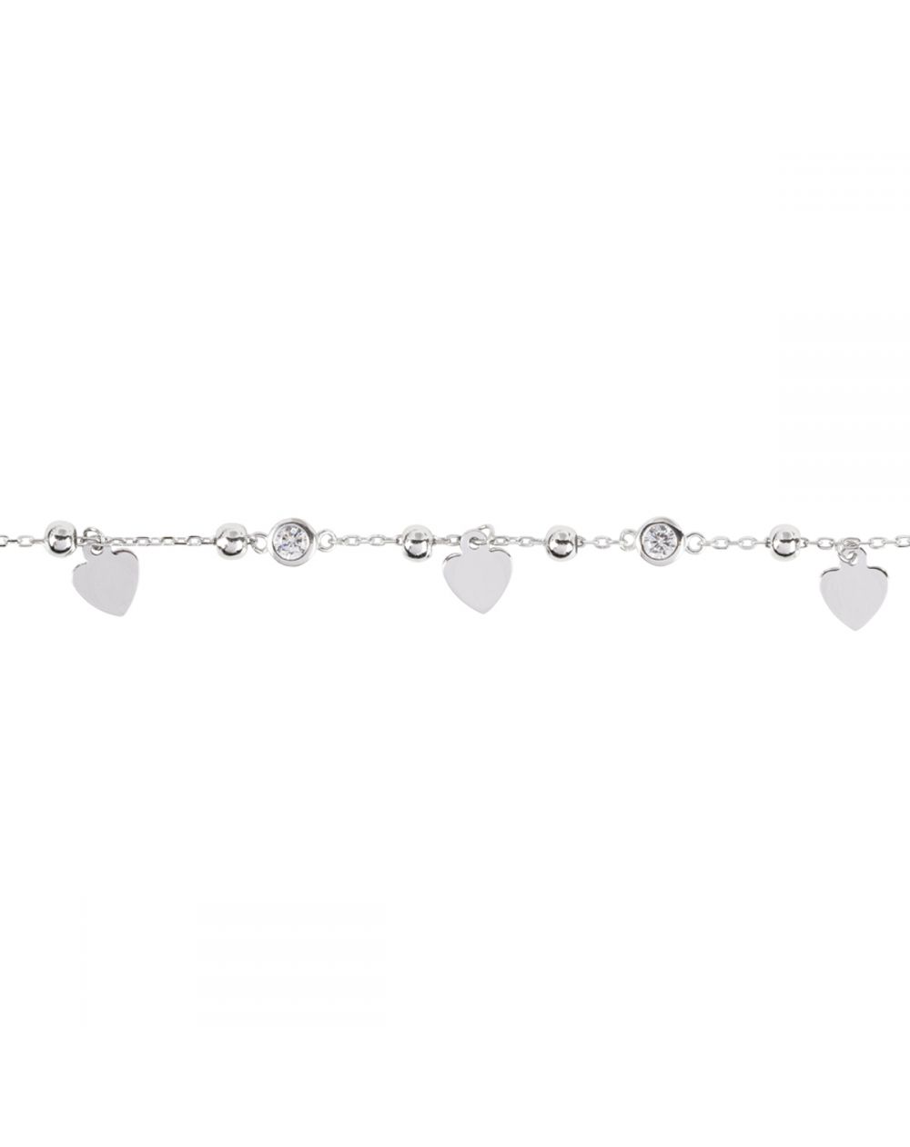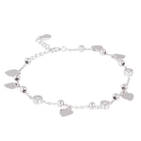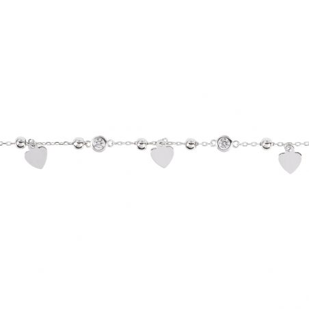 Ce bracelet argent femme est un bracelet en argent 925 doté de plusieurs breloque en forme de coeur. Des pierres et de petits sphères parcourent également le bracelet.
