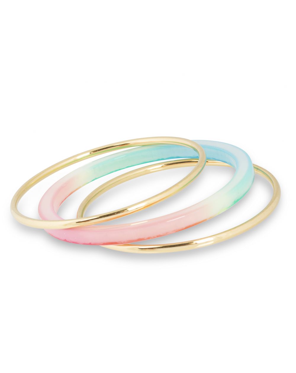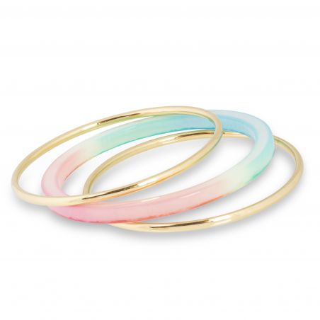 Composé de 3 bracelets rigides, ce trio est composé de 2 bracelets en acier doré et d'un en résine avec un dégradé de vert turquoise, blanc et rose.