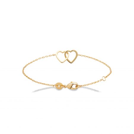 Bracelet délicat en plaqué or 18K, orné de deux cœurs entrelacés. Fin, romantique et hypoallergénique, il se porte tous les jours et s’offre facilement. Garantie 10 ans sur le plaquage.