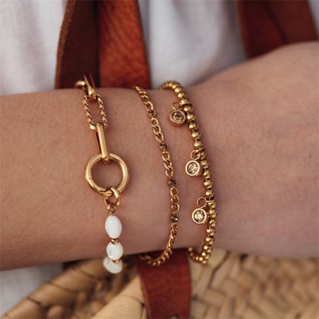 Le bracelet iXXXi Dot Topaz séduit par son éclat subtil et son design raffiné. Composé de perles dorées en acier inoxydable, il est délicatement orné en son centre de trois éléments sertis de zirconia couleur topaze, apportant une touche lumineuse et élégante à votre poignet.