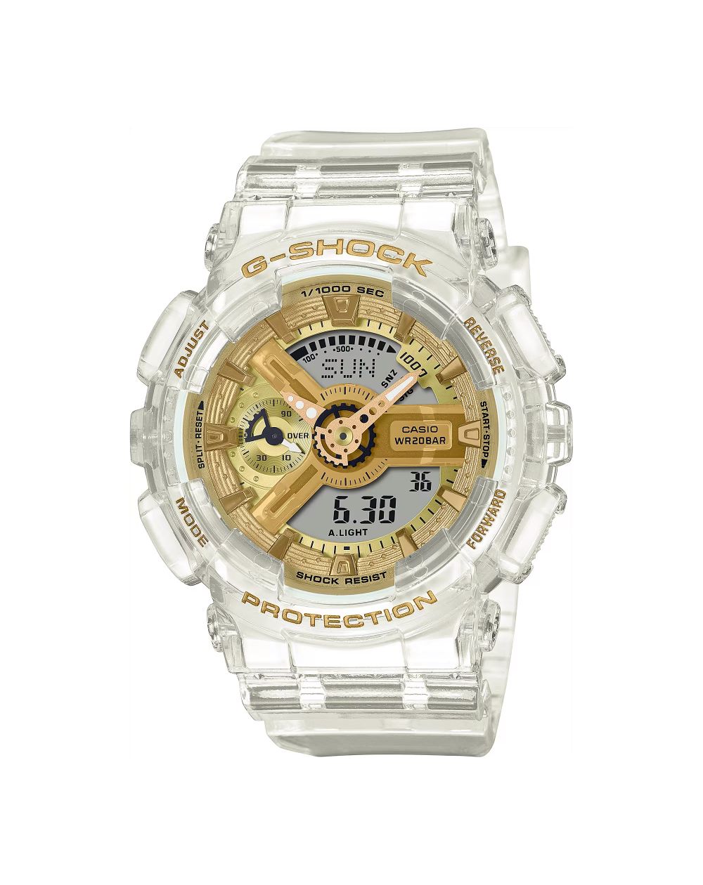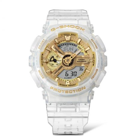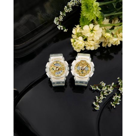 Cette montre CASIO est dotée d'un cadran doré brillant grâce au dépôt de vapeur métallique, tranche avec la transparence du bracelet pour un résultat chic et étincelant.