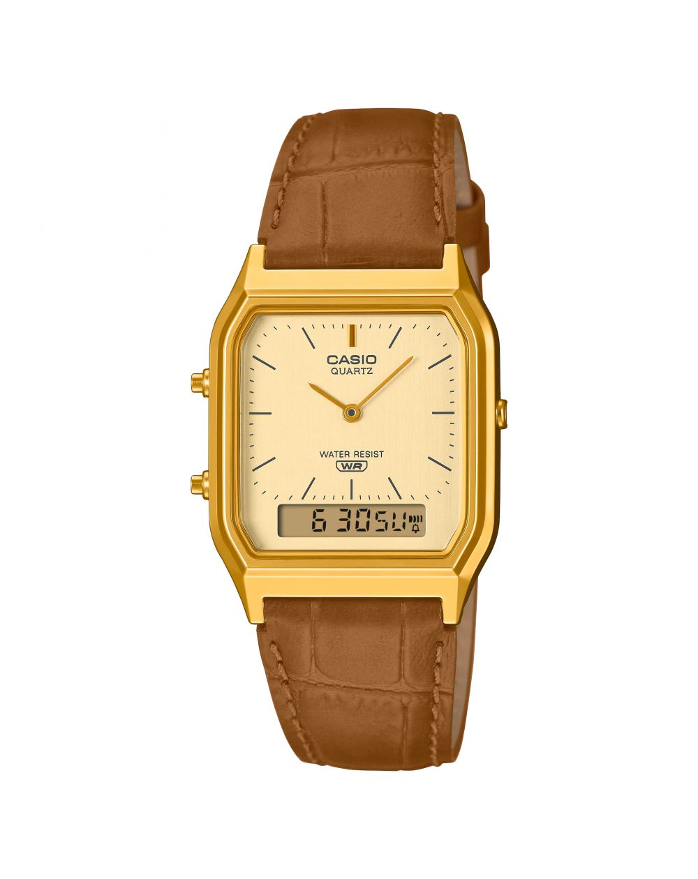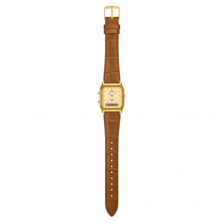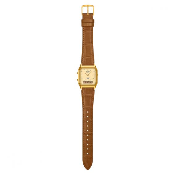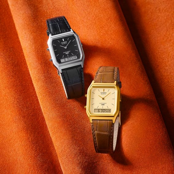 Inspirée de la célèbre AQ-230, cette montre allie finesse et praticité. Étanche, légère et équipée d’un chronomètre ainsi que d’une alarme, elle se porte au quotidien sans compromis. Son bracelet en cuir véritable, travaillé avec un effet texturé délicat, ajoute une touche intemporelle et renforce son caractère sophistiqué.
